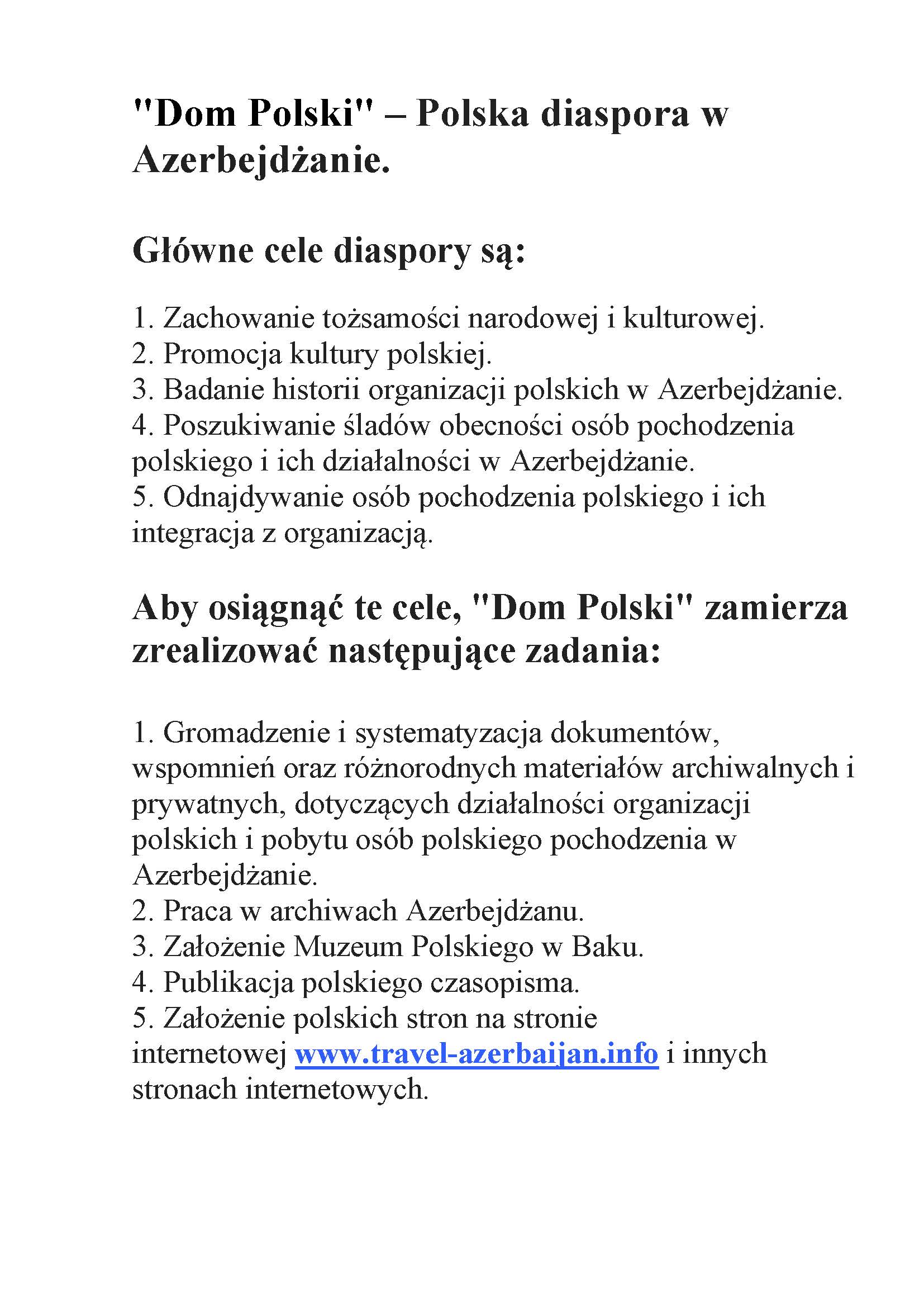 1.Сбор и систематизация документов, воспоминаний, различных архивных и частных материалов о деятельности польских организаций в Азербайджане и пребывании лиц польского происхождения.